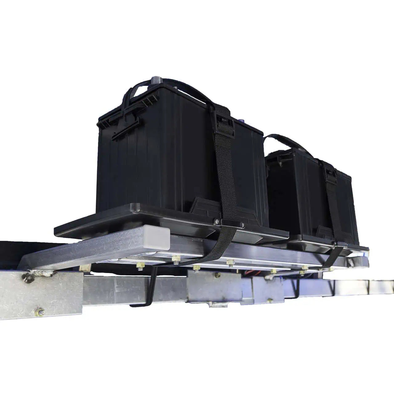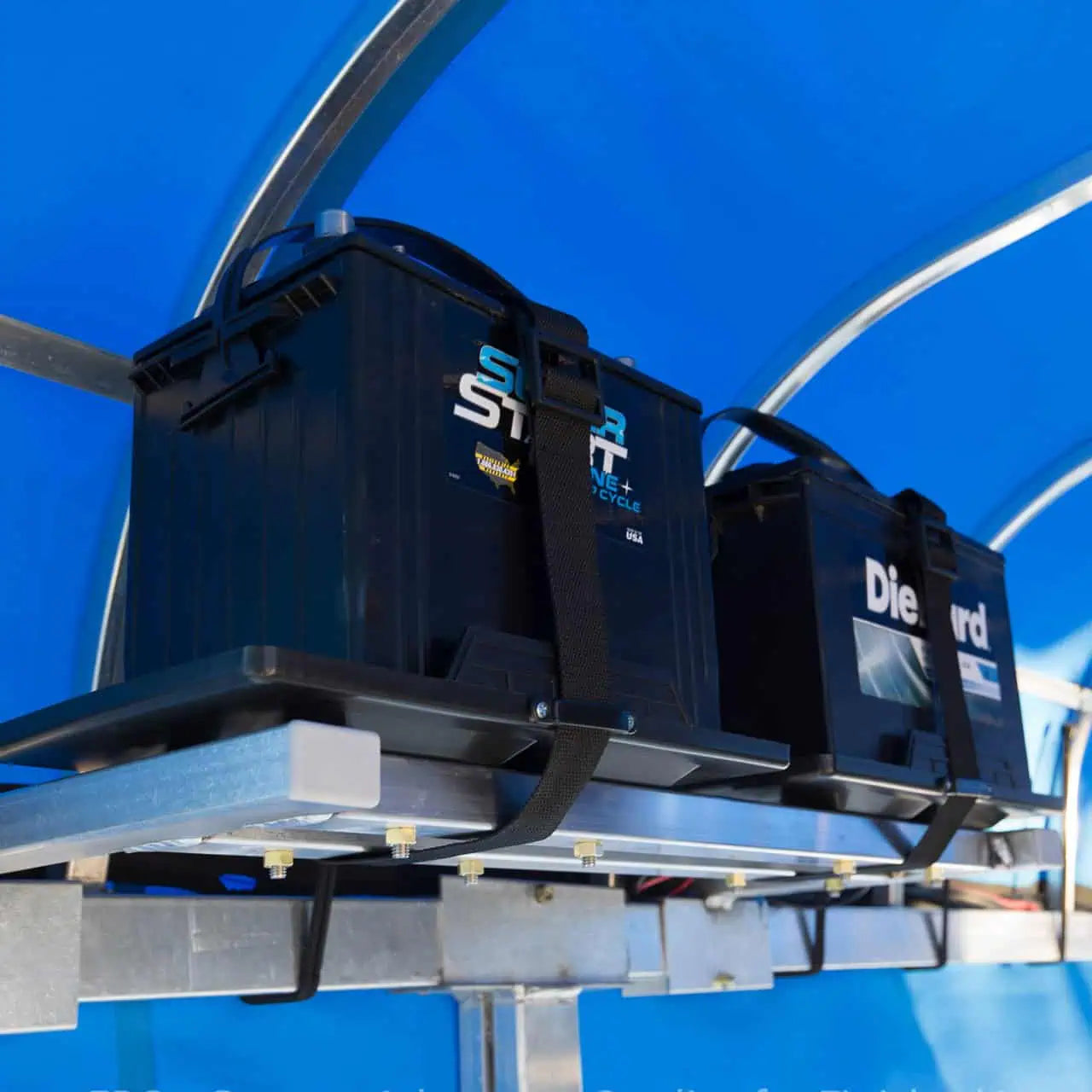 Conveniently mounts to inside of canopy frame offering a clean look while protecting the battery from the elements. Holds up to two group 27 batteries.